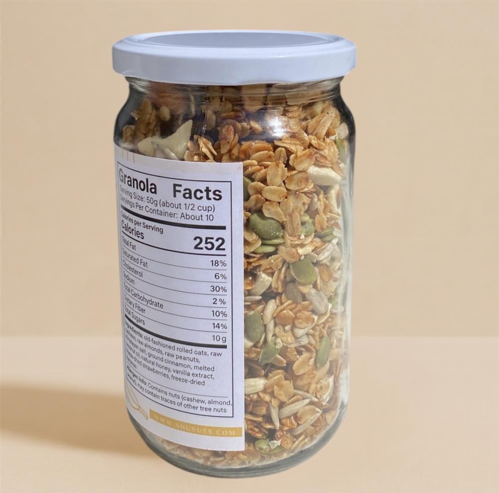 المكونات: شوفان عضوي، موز مجفف بالتبريد، كاجو، لوز، فول سوداني، عسل طبيعي، حبوب دوار الشمس، بذور اليقطين، زيت جوز الهند العضوي المعصور على البارد، مستخلص فانيلا عضوي، قرفة، ملح الهيمالايا.